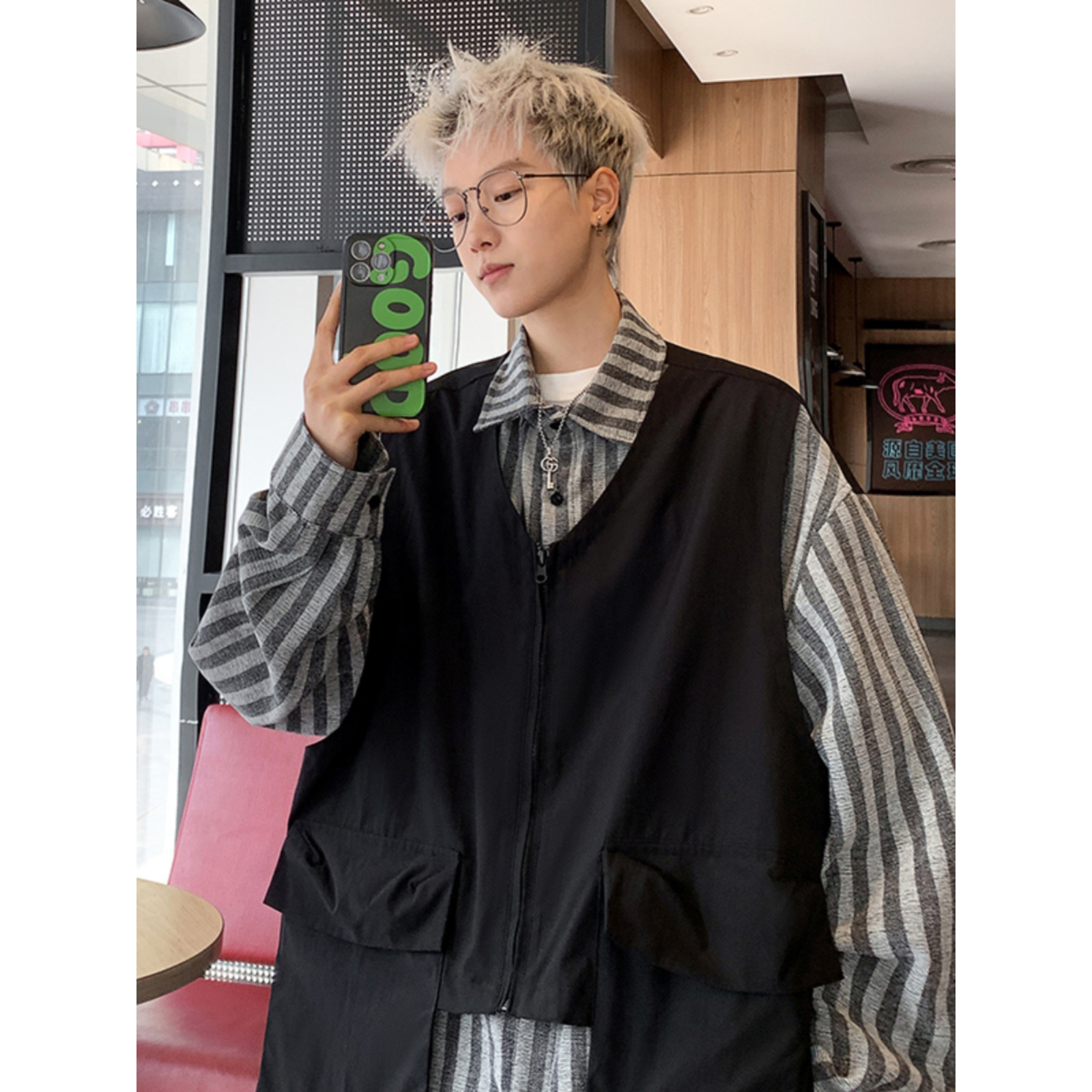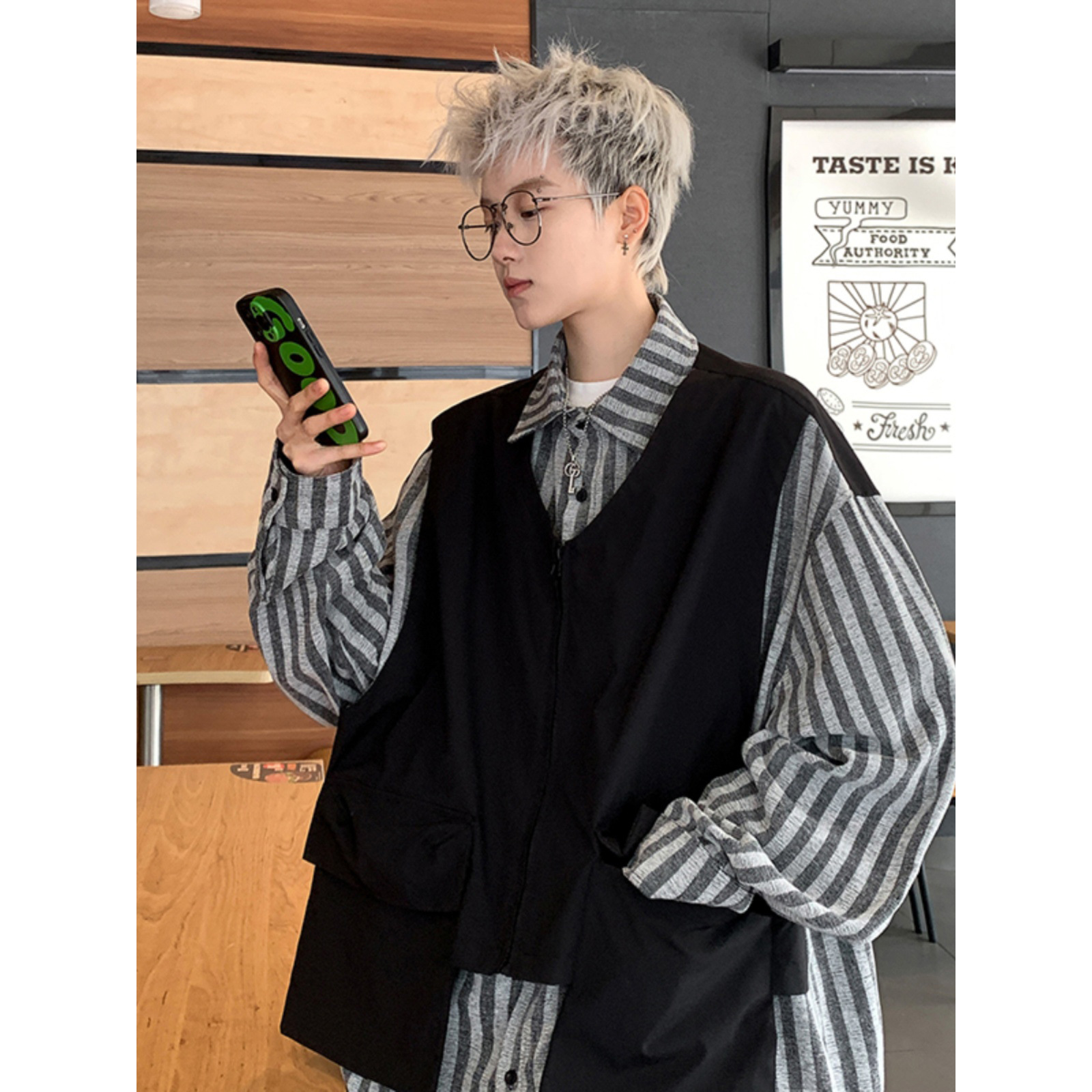 Fake Two-piece Striped Shirt Men's 2024 Autumn New Japanese Retro Trendy Brand Workwear Vest Long-sleeved Shirt Jacket