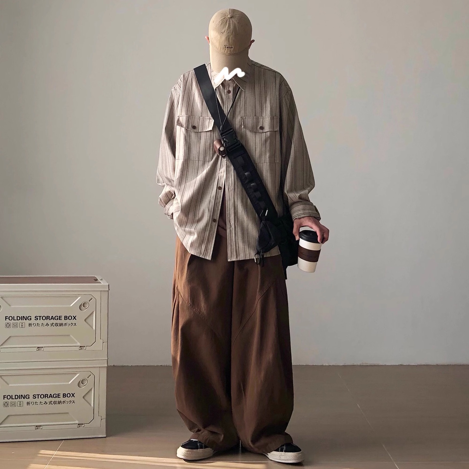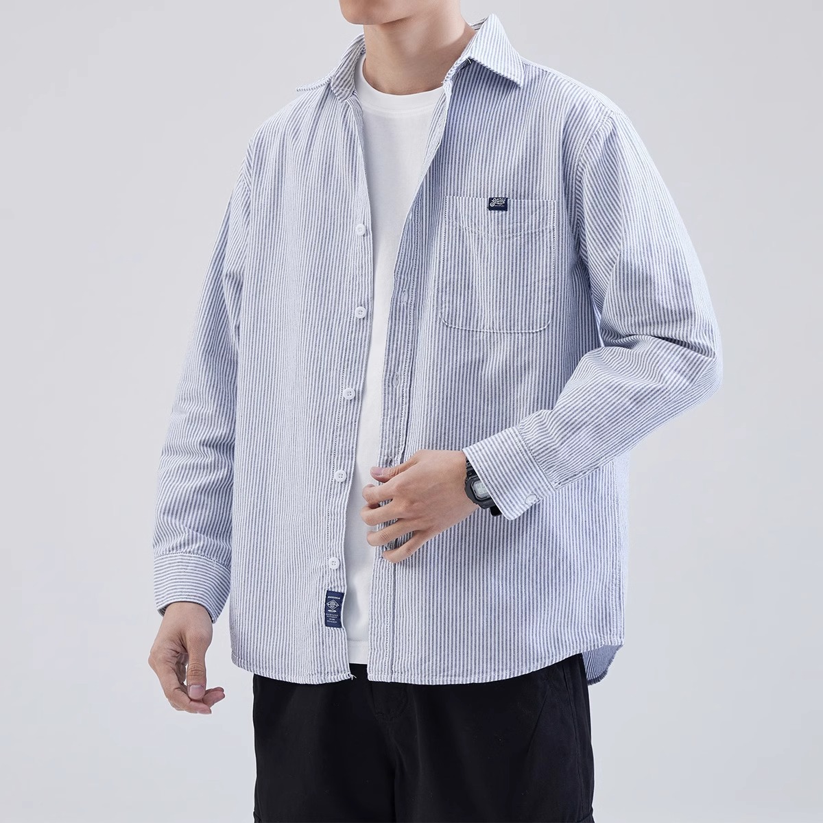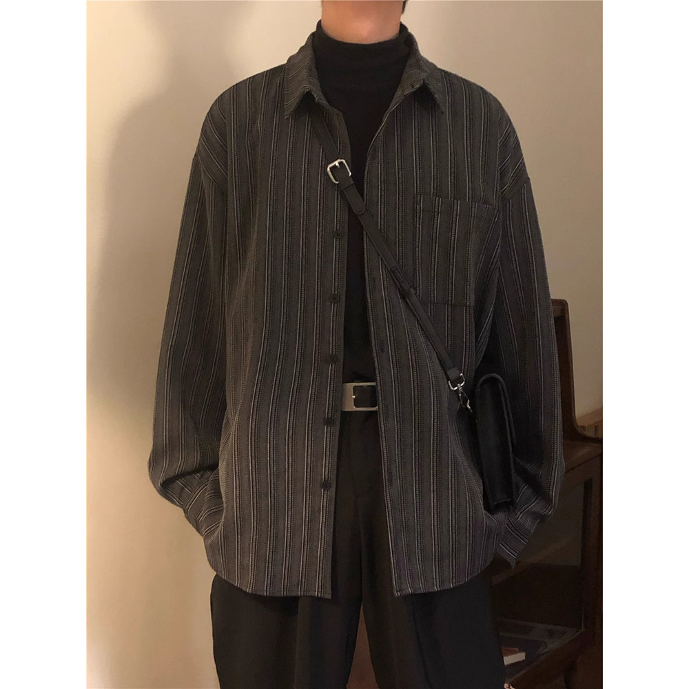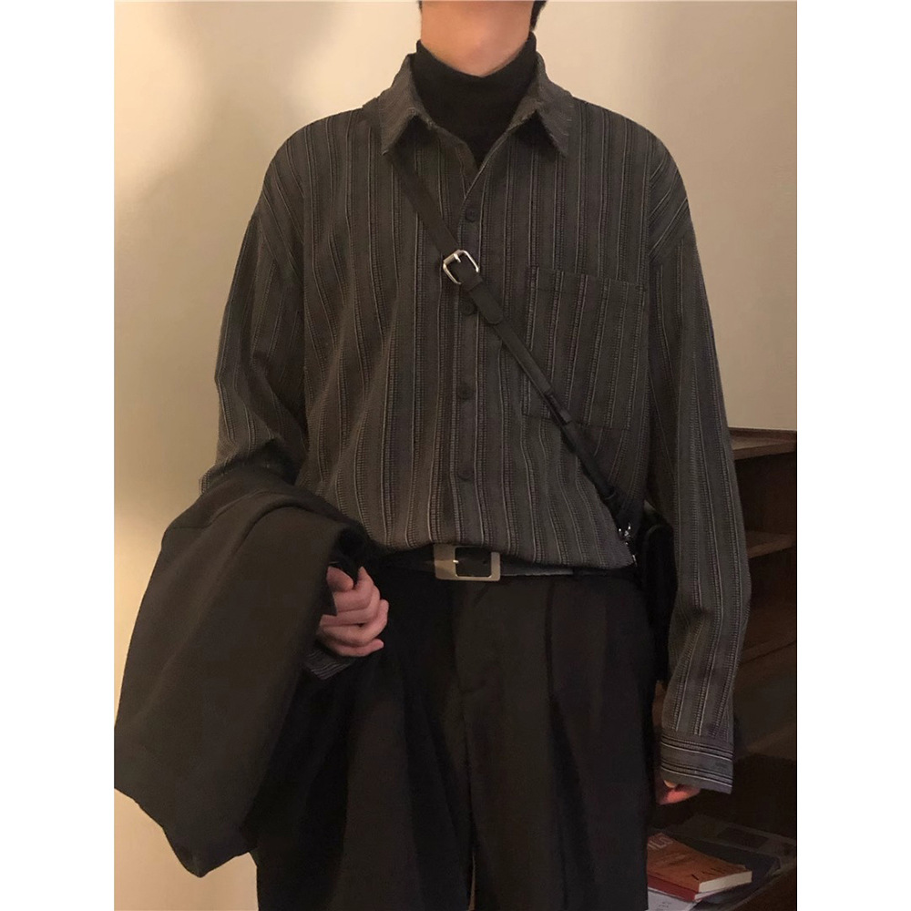 High-end feeling ruffian handsome loose striped long-sleeved shirt men's spring and autumn new Japanese retro bottoming shirt ins trendy