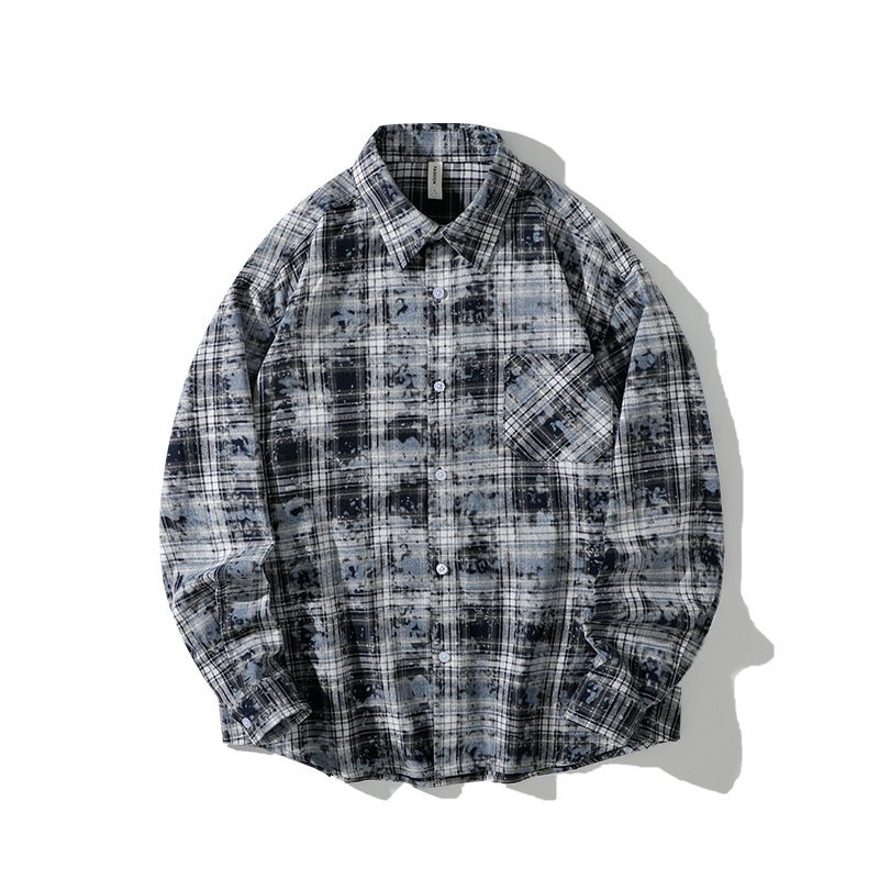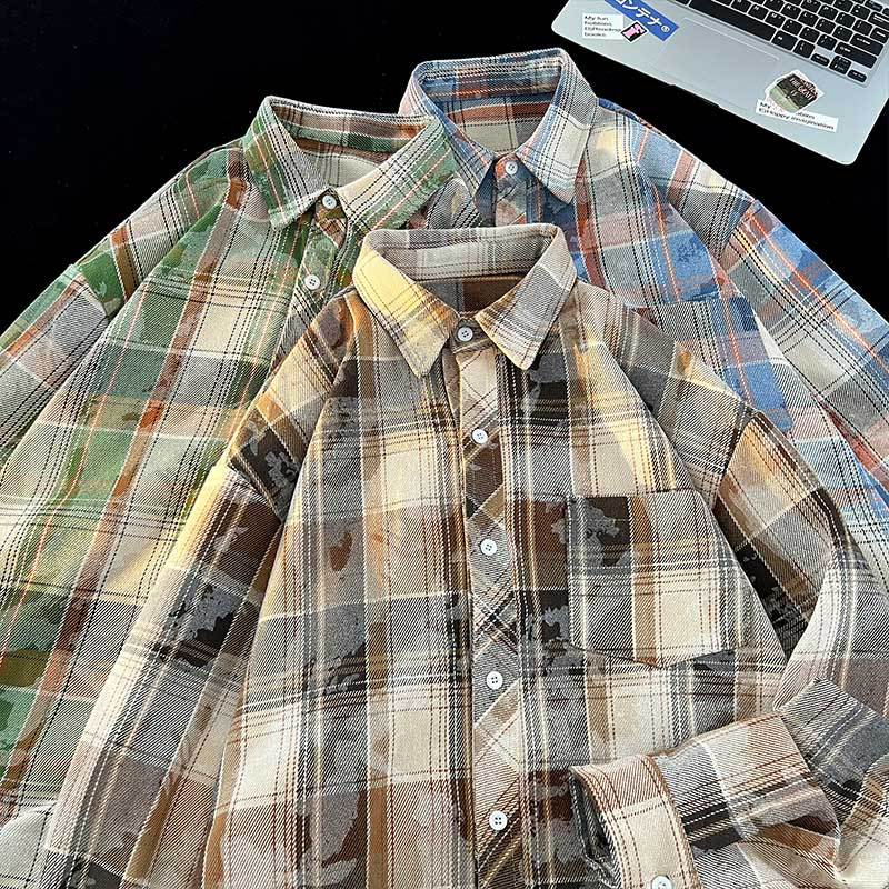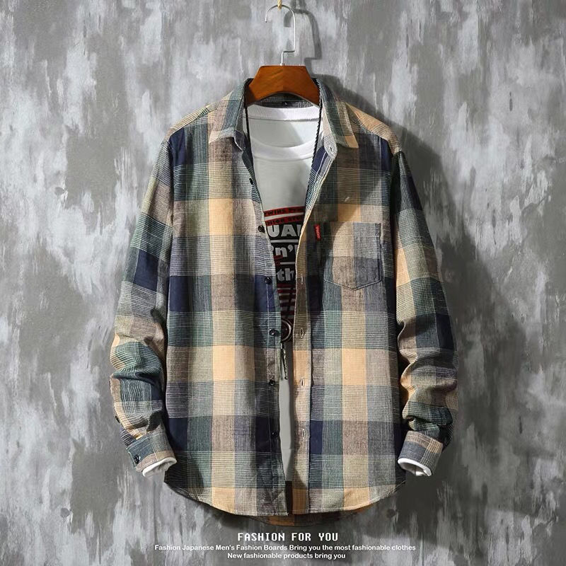 high quality Long-sleeved Plaid Shirt Men's Korean-style Lapel Long-sleeved Jacket Top Fashion Trendy Men's All-match Shirt