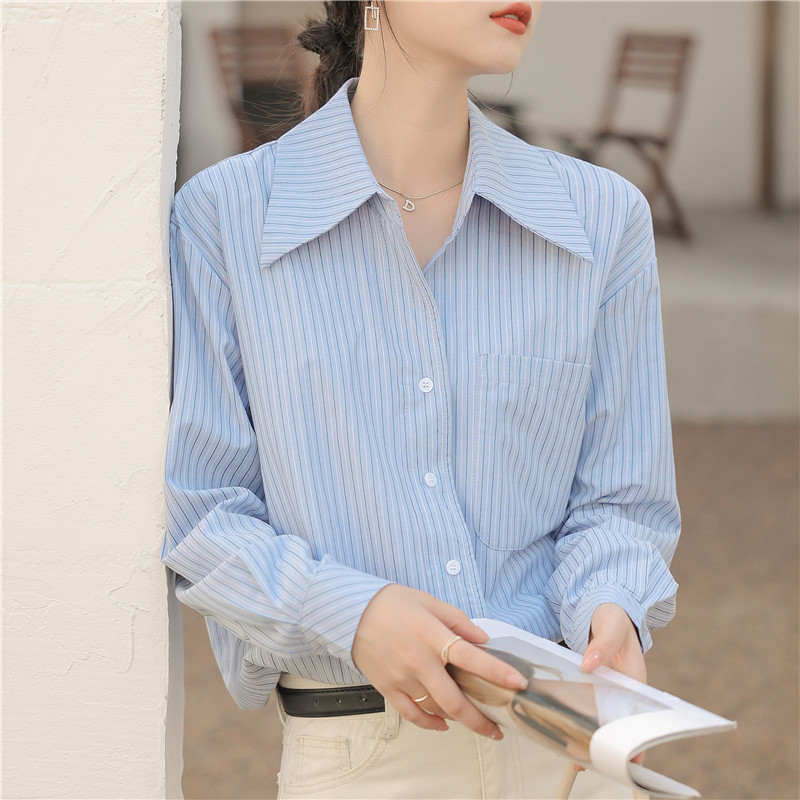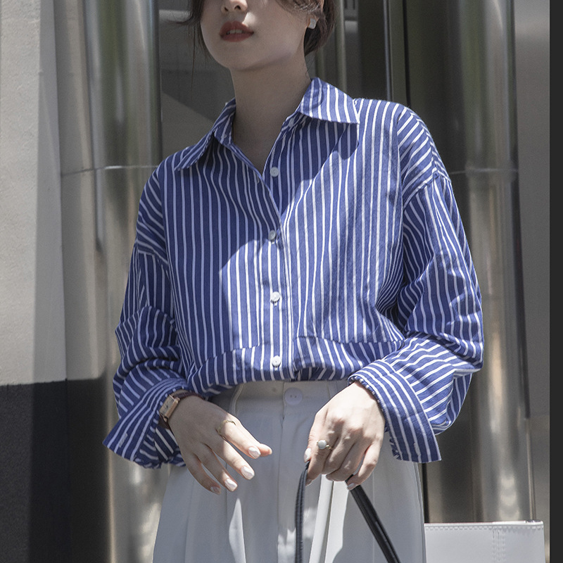 In stock design blue striped shirt Women's stacked 2023 spring and autumn blue and white striped long sleeve